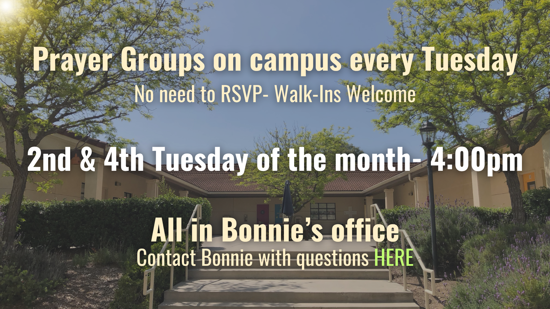 You can also join our prayer team on campus on a weekly basis. Please see below.