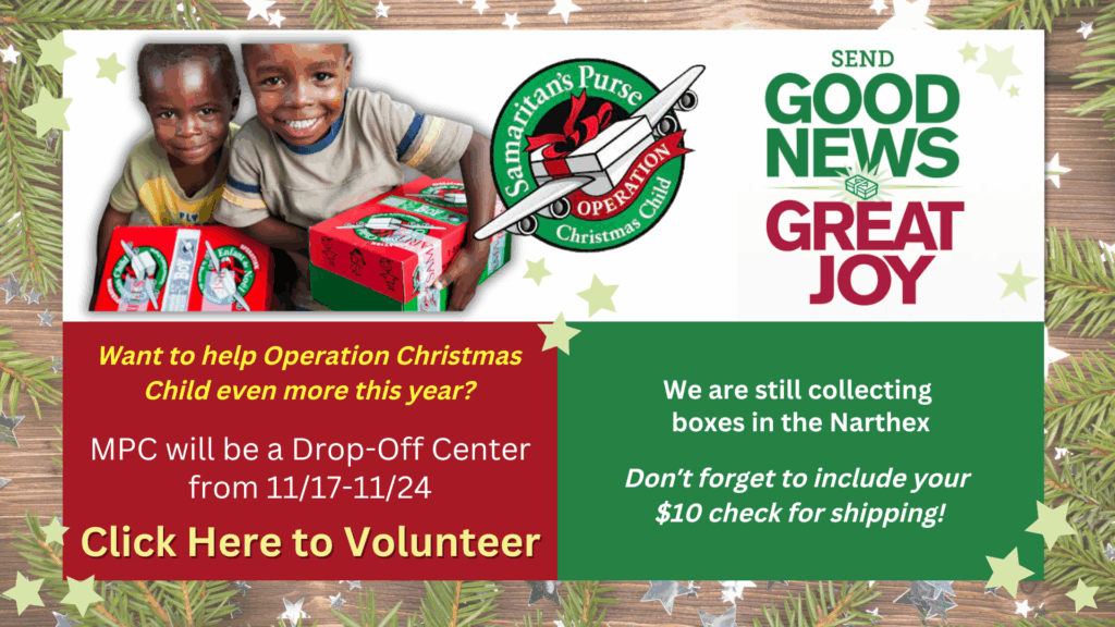 Collecting now in the Sanctuary Lobby. Labels and boxes will be provided, or you can use plastic shoe size boxes from any dollar store. Please remember to include your $10 check for shipping!