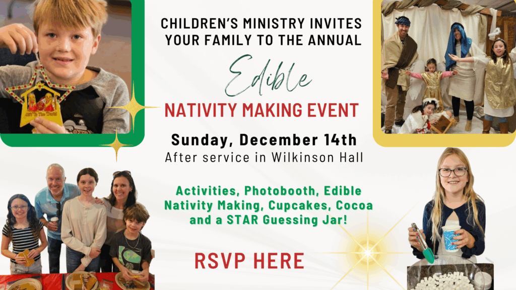 Children’s Ministry invites you and your children to the 3rd Annual Edible Nativity Making Event! It will be a fun and meaningful self-paced event. You will make an Edible Nativity scene, complete a fun “Follow the Star” activity (includes your family reading verses together), make an ornament, take a family photo at the Nativity photo booth, drink hot cocoa, and eat cupcakes. Children must be accompanied by an adult please. This is meant to be a family experience and we pray your family will be blessed.